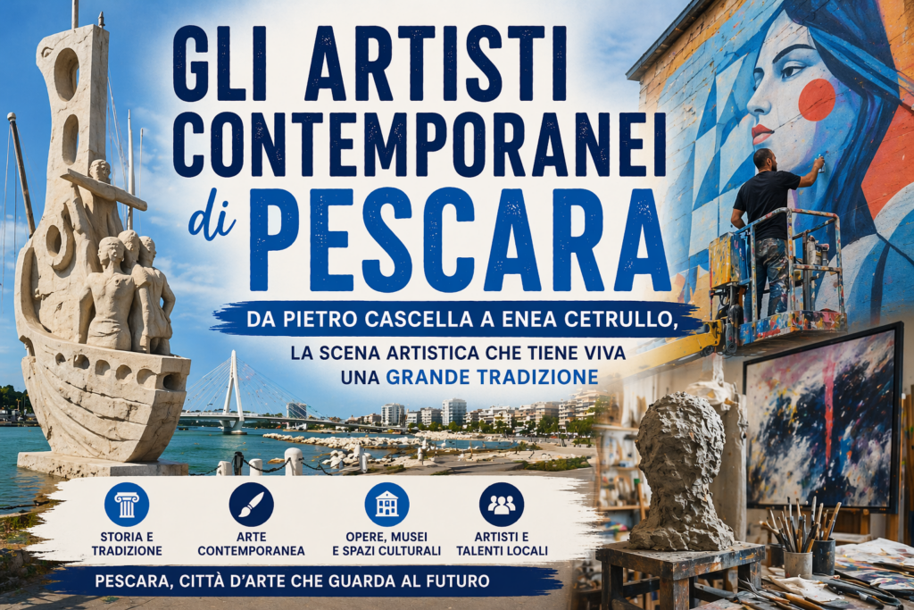 Pescara è una città che ha prodotto artisti straordinari per secoli da Michetti a Basilio Cascella, da D’Annunzio alla famiglia che porta il suo nome. Ma la tradizione artistica pescarese non si è fermata al Novecento: ha continuato a crescere, a trasformarsi, a moltiplicarsi in forme nuove. Pittori, scultori, incisori, ceramisti e artisti che hanno scelto di raccontare Pescara, il suo mare, il suo fiume, la sua luce, la sua storia. Alcuni hanno lasciato opere permanenti che si vedono ancora oggi passeggiando per la città. Altri hanno portato il nome di Pescara nei musei e nelle gallerie di tutto il mondo. Tutti, a modo loro, hanno tenuto viva una vocazione artistica che è nel DNA di questa città adriatica.